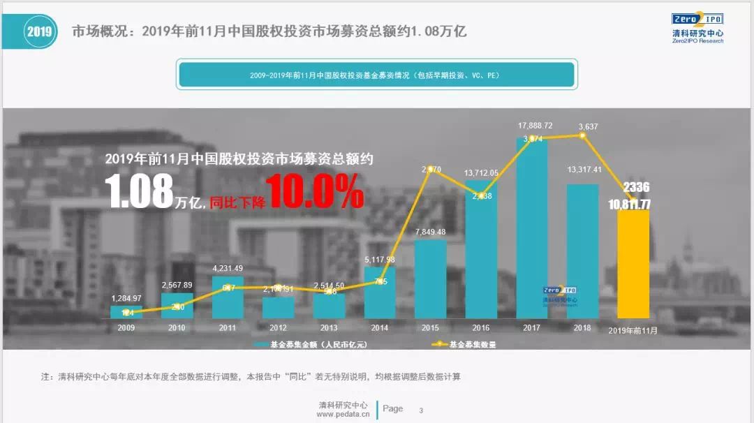 清科数据显示,2019年前11个月,中国股权投资市场募资总额是1.08万亿,虽然表面上与2018年同期相比仅下降10%,但除去国有背景的基金,民营机构募资仍然十分惨淡。
