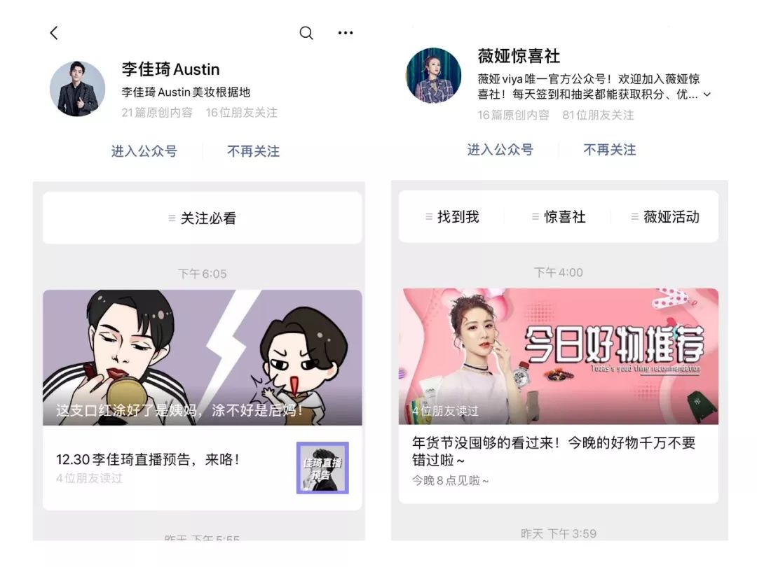 a、微信公众号:李佳琦的微信公众号主要承担三个功能:一是聚粉,二是导流,三是预告。