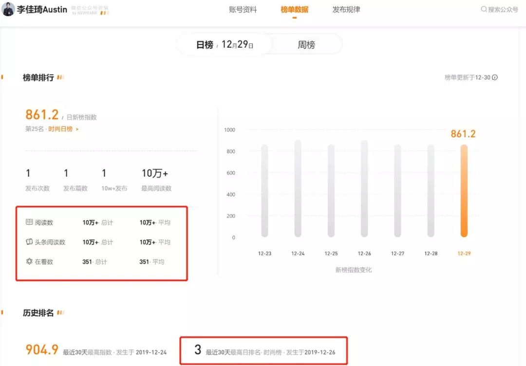 其中12月16-22日这周,李佳琦Austin这个公众号的综合评分排在第10位,12月26日最高评分排在时尚类目的第3名。