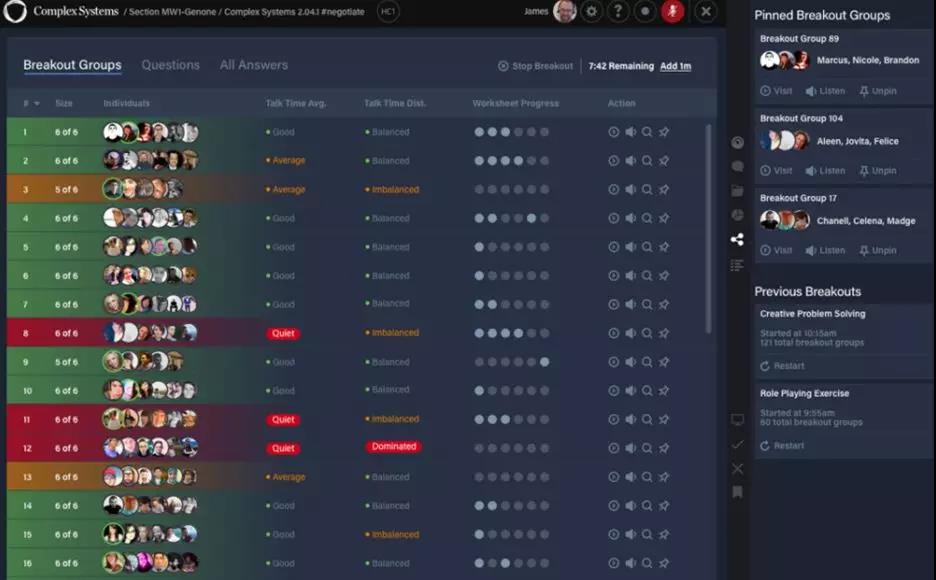 生活在不同地区的学生们可以同时在平台上参与分组讨论、团队陈述、辩论、模拟以及分享编辑文档,教授也可以点名学生回答问题,或穿梭在不同的讨论小组观察情况,还可以进行课堂测验。