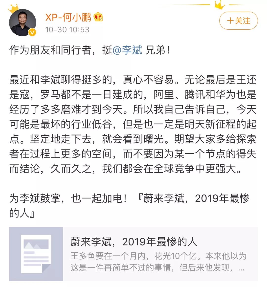 去年,李斌赢得何小鹏“年底一万辆新车”赌约的情景还在,但今年就都成了“难兄难弟”,何小鹏曾发文力挺:“作为朋友和同行者,挺@李斌兄弟!”