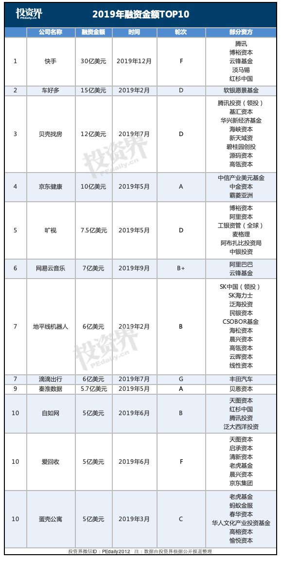 回顾2019年,创业公司因融不到资而倒闭的消息接踵而至。而另一面,各个行业的明星企业却获得动辄几亿、甚至几十亿美元的巨额融资。根据公开信息,投资界(微信ID:pedaily2012)整理了2019年融资金额最大的前10笔,一窥这一年创投圈冷热。