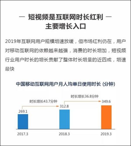 但短视频依然是移动互联网大盘中几乎还在唯一增长的明星级应用领域,而互联网女皇报告也显示短视频是互联网时长红利唯一的增长入口,从2017年4月到2019年4月,中国短视频App日均使用时长已从不到1亿小时,增长到了6亿小时,两年的增长率高达600%。