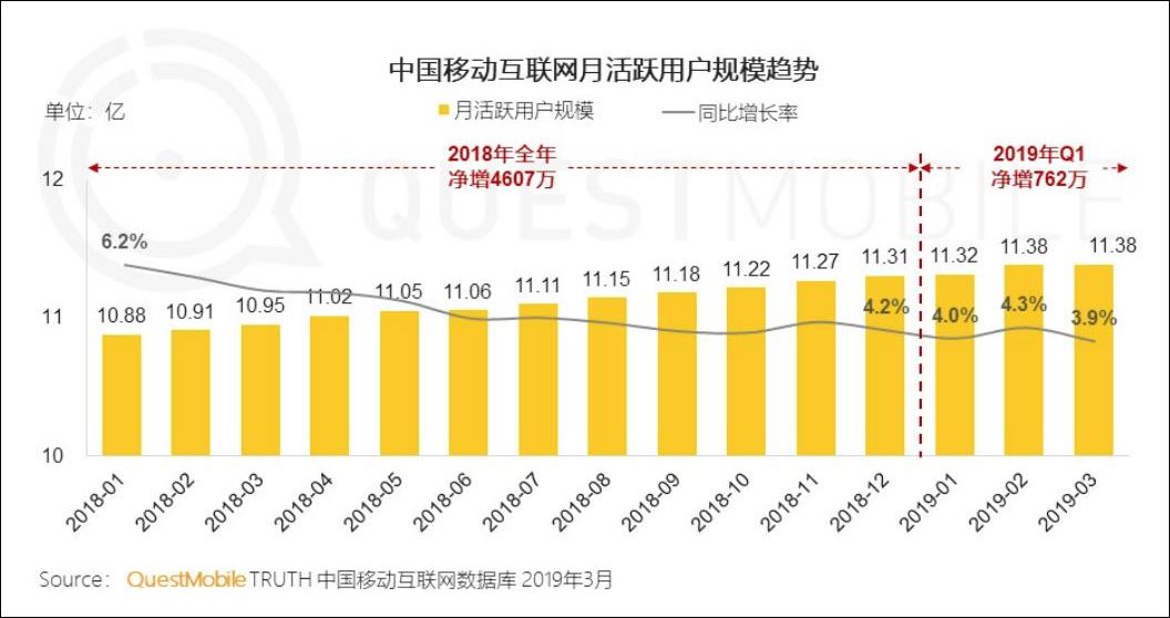 回顾过去的2019年,整个移动互联网大盘增长在进一步放缓,3月份同比增速更是首次跌破了4%。