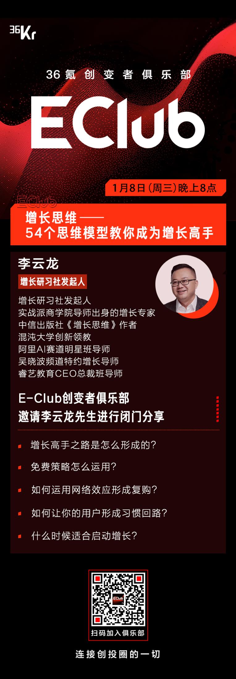 欢迎成为36氪[E-Club创变者俱乐部]一员,享受36氪生态资源带来的长期赋能。
