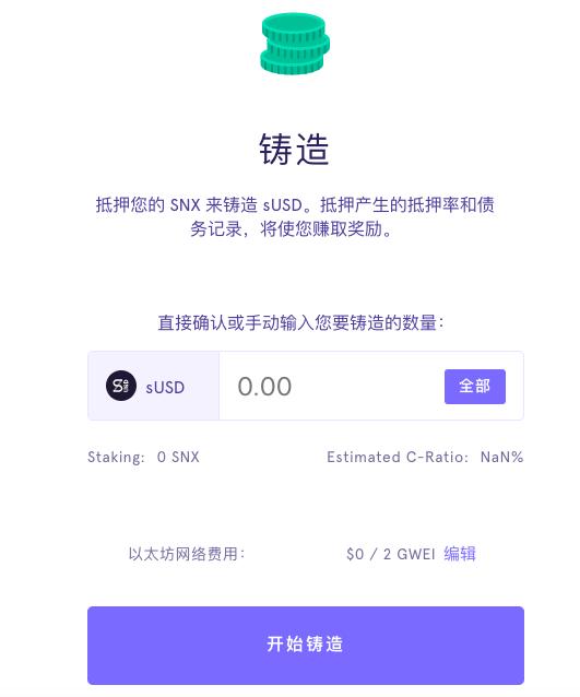 当用户持有 SNX 后,可以使用 Mintr(https://mintr.synthetix.io/)将 SNX 代币进行抵押,生成合成资产 sUSD。