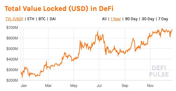 根据 defipulse 数据显示,近一年来,各类 DeFi 应用中抵押的资产总额从 2.75 亿美元增长到 6.86 亿美元,翻了将近 3 倍。