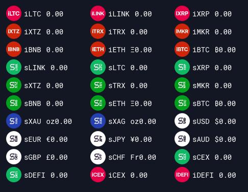 加密货币合成资产包括 sBTC、sETH、sBNB 等;