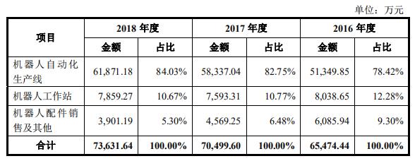 其中,2016-2018年实现机器人自动化生产线营收分别为5.13亿元、5.83亿元和6.19亿元,占主营业收入的比例分别为78.42%、82.75%和84.03%,为公司收入的最主要来源。