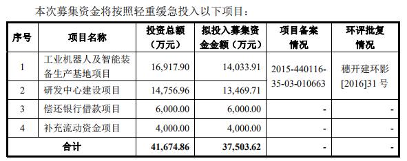 瑞松科技计划募资金额为3.75亿元,主要投向工业机器人及智能装备生产基地项目、研发中心建设项目,另有6000万元是用来偿还银行借款。