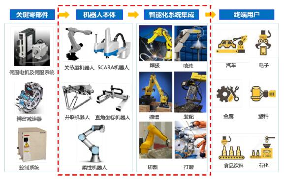 机器人行业产业链由机器人零部件生产厂商、机器人本体生产厂商、系统集成商、终端用户四个环节组成。