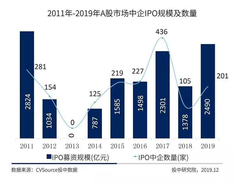 图表 4 2011年-2019年A股市场中企IPO规模及数量