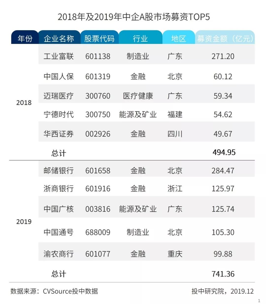 表格 1 2018年及2019年中企A股市场募资TOP5