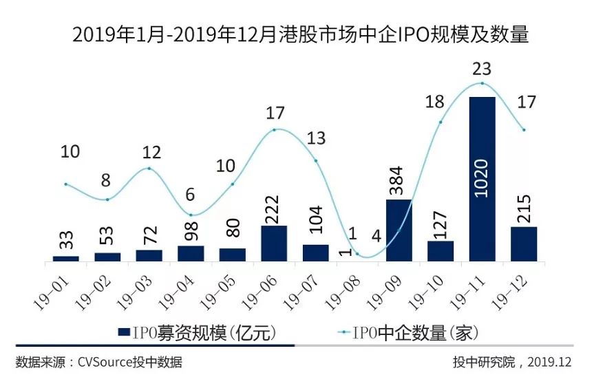 图表 7 2019年1月-2019年12月港股市场中企IPO规模及数量