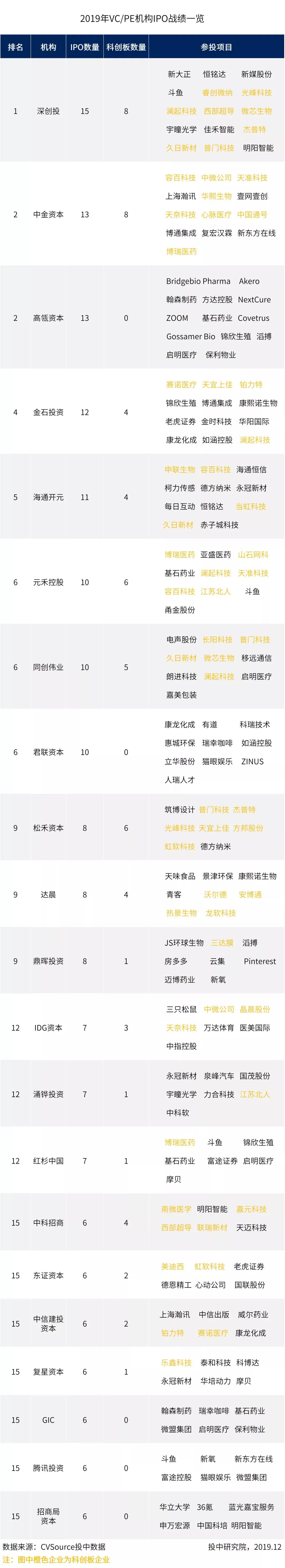 下表为2019年VC/PE机构IPO战绩统计,深创投IPO战绩夺魁,共参投15家,含8家科创板上市企业。(见表格7)