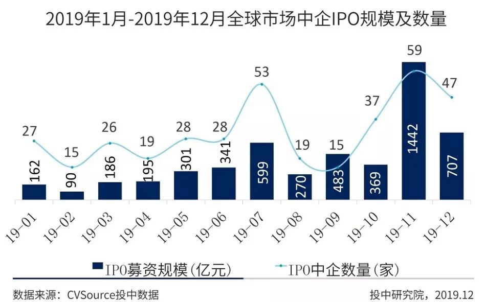 图表 3 2019年1月-2019年12月全球市场中企IPO规模及数量