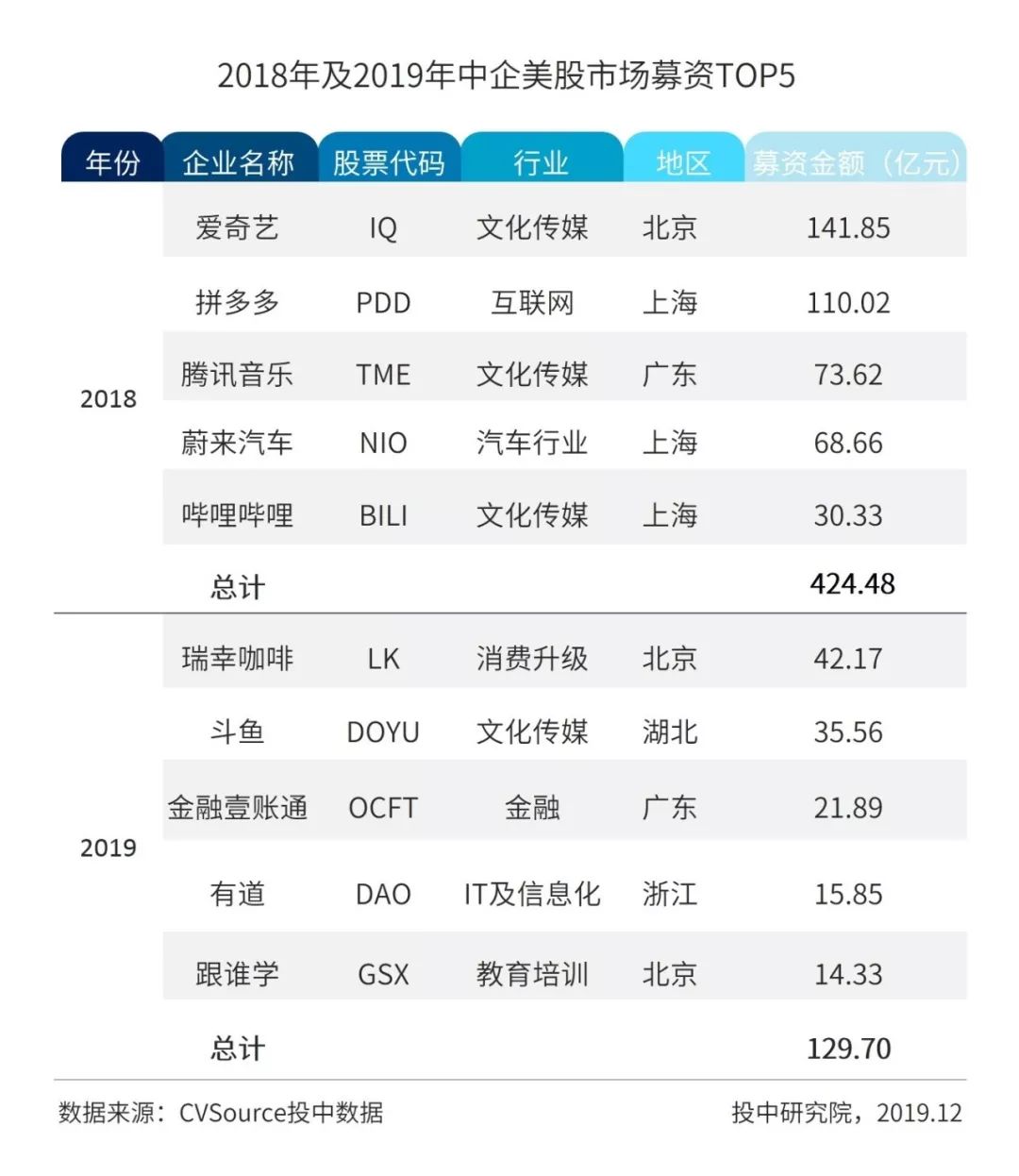 表格 4 2018年及2019年中企美股市场募资TOP5