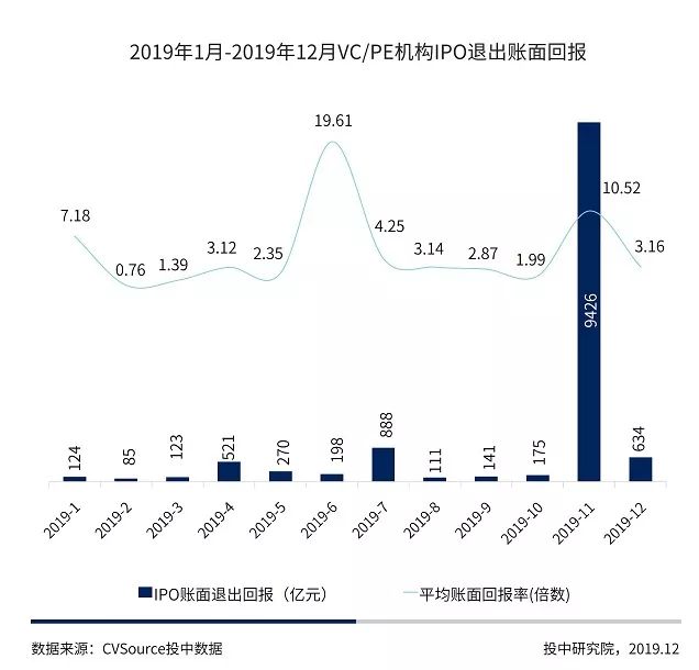 2019年,共215家具有VC/PE背景的中企实现上市,VC/PE机构IPO渗透率为57.64%;IPO账面退出回报规模为12714.23亿元,其中包含63家科创板企业,科创板企业退出回报总规模为1090.19亿元,占总退出回报规模的8.57%;整体来看,平均账面回报率波动较为显著,VC/PE机构IPO账面退出回报金额主要集中在11月,其中阿里巴巴-SW(09988.HK)11月26日上市,软银集团的退出账面回报便已高达8,524.56亿元。(见图表14)