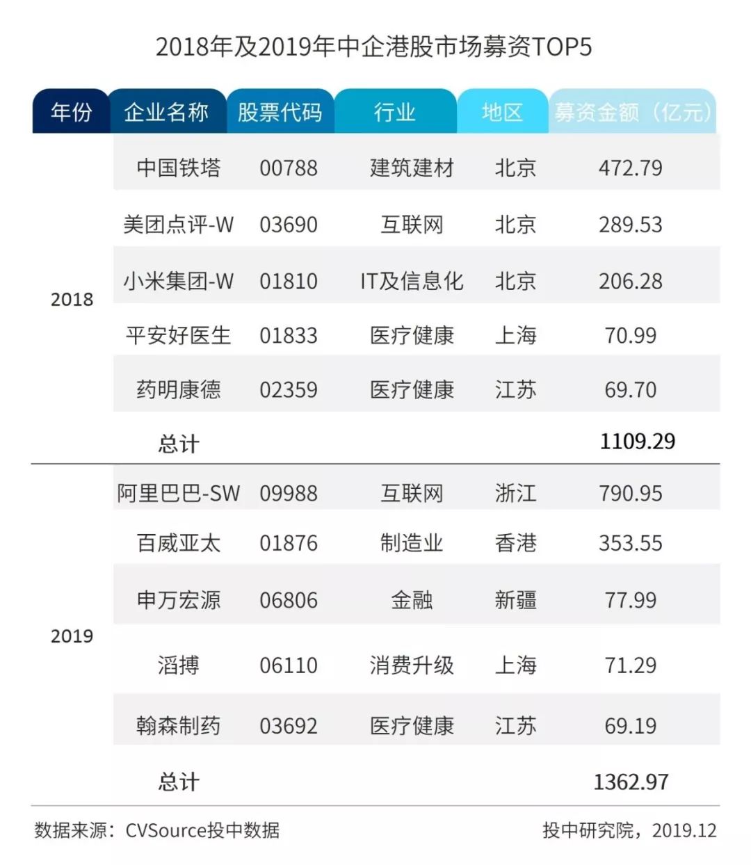 表格 2 2018年及2019年中企港股市场募资TOP5
