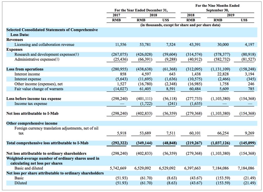 2017年、2018年和2019年前三季度,天境生物的净亏损分别为2.98亿元、4.03亿元和11.03亿元;2017年和2018年,天境生物的研发费用为2.67亿元和4.26亿元人民币,分别占研发和行政费用总额的91.3%和86.5%,2019年前三季度的研发费用则为5.78亿元人民币,天境生物表示在可预见的未来,其研发费用将会进一步增加以扩张产品线。