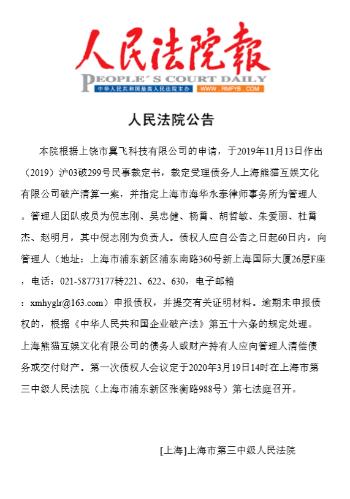 1月6日,人民法院公告网公布的破产文书显示,上海市第三中级人民法院根据上饶市翼飞科技有限公司的申请,于2019年11月13日作出(2019)沪03破299号民事裁定书,裁定受理债务人上海熊猫互娱文化有限公司破产清算一案,并指定上海市海华永泰律师事务所为管理人。