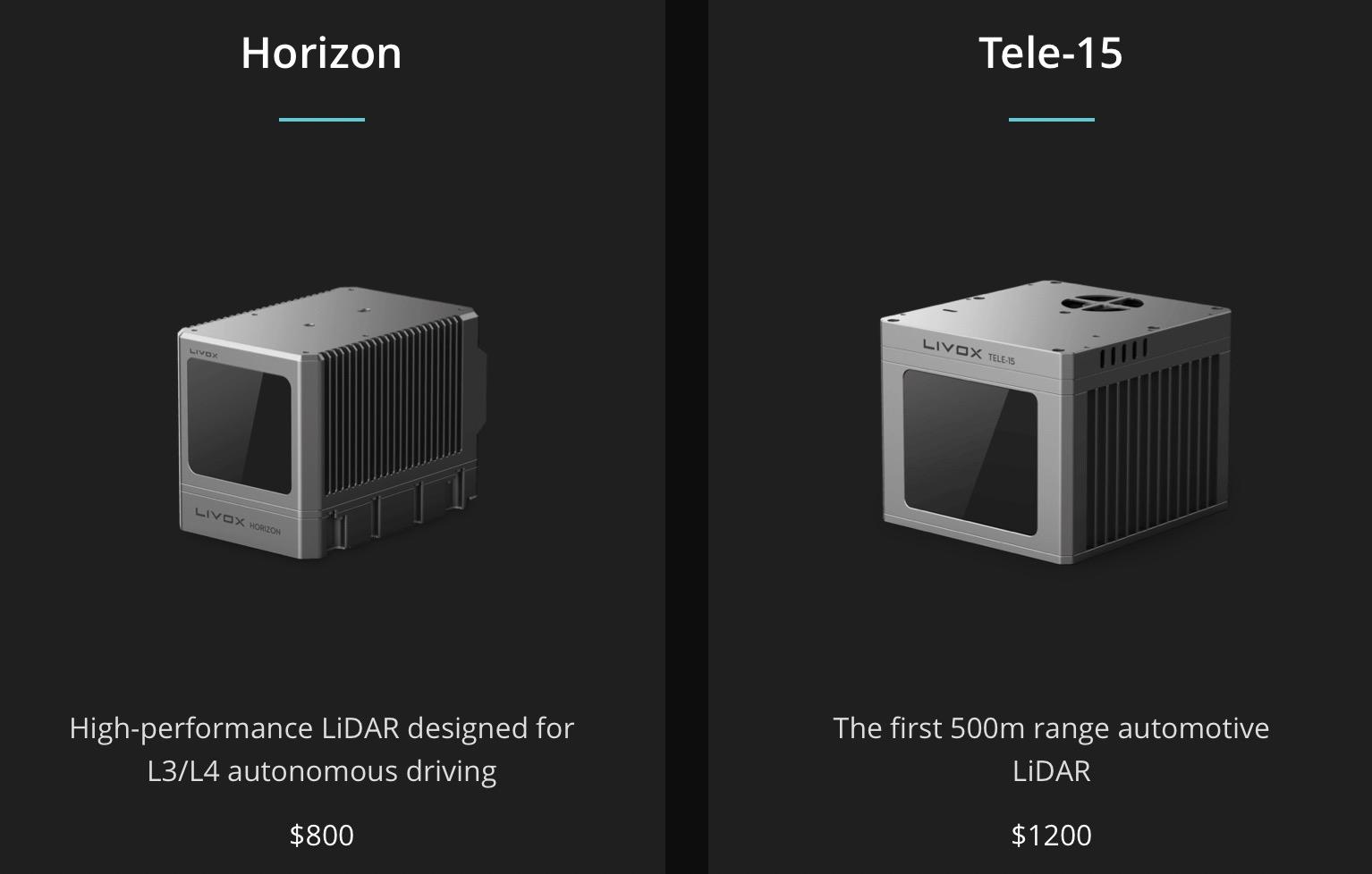 其中Horizon专为L3/L4级自动驾驶汽车设计,标称探测距离260米,官网价格为800美元。Tele-15号称是全球首个探测距离达到500米的车载激光雷达。官网价格为1200美元。Horizion可在1月7日开始订购,Tele-15将于2020年第二季度正式推出。