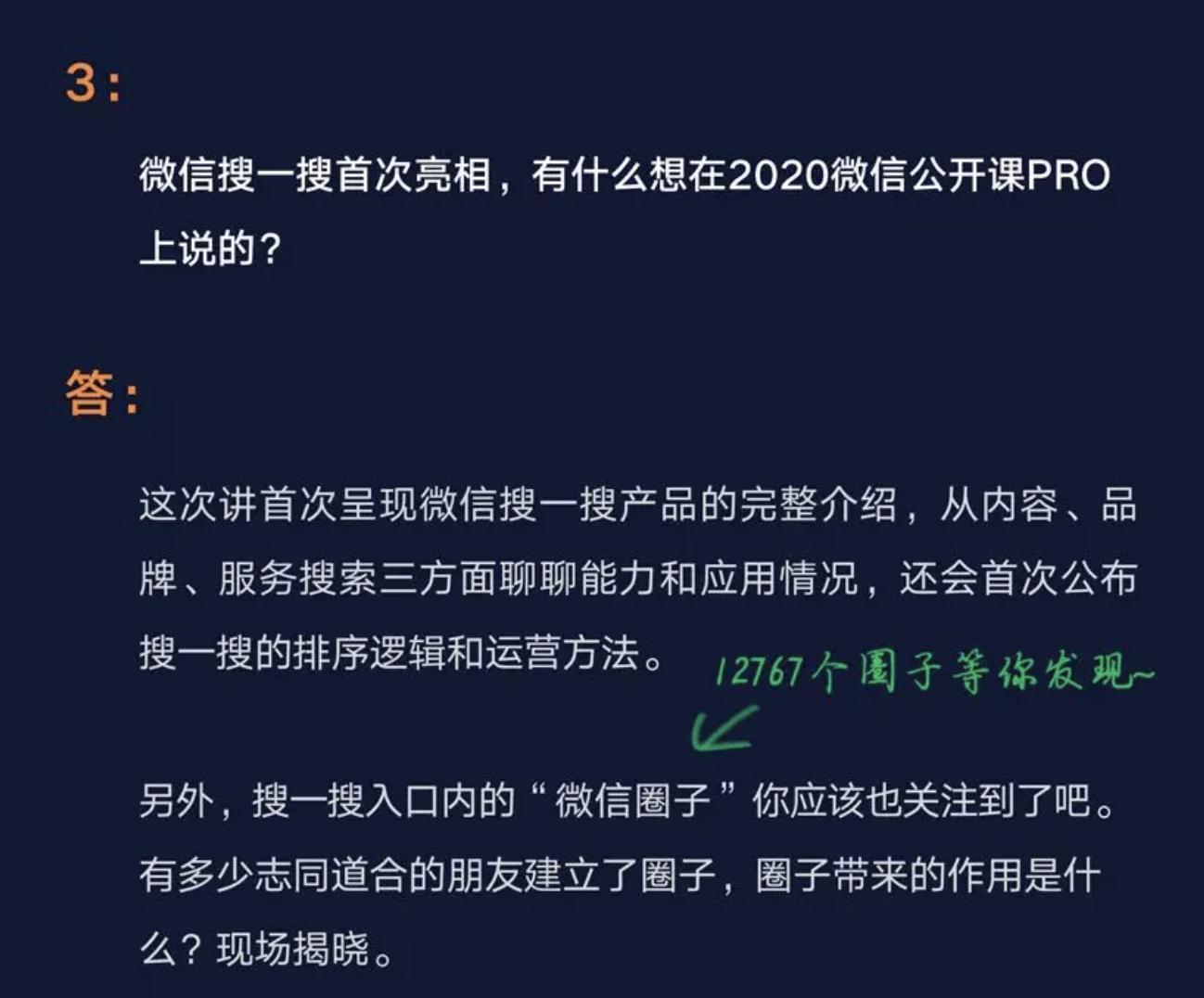 另外,2019 年 12 月,“微信圈子”在微信正式上线。在新版本的微信里,只需要开启搜一搜,就可以在搜索界面中看到圈子的入口。这个有点像豆瓣、贴吧的新功能一直处于默默无闻的状态,但微信公开课上将会具体讨论它的作用和成绩。