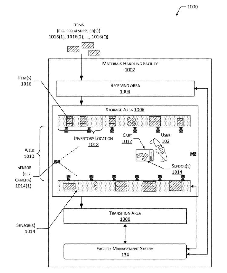 刷手技术没有停留在理论层面,而是已经被加入了亚马逊无人店全家桶。在专利文件最后,亚马逊也介绍了如何将人手识别纳入 Amazon Go 现有的验证体系,说明了从刷手验明正身、到在无人店内使用各种传感器检测用户购物行为、最终从用户绑定账户中扣款的全过程。