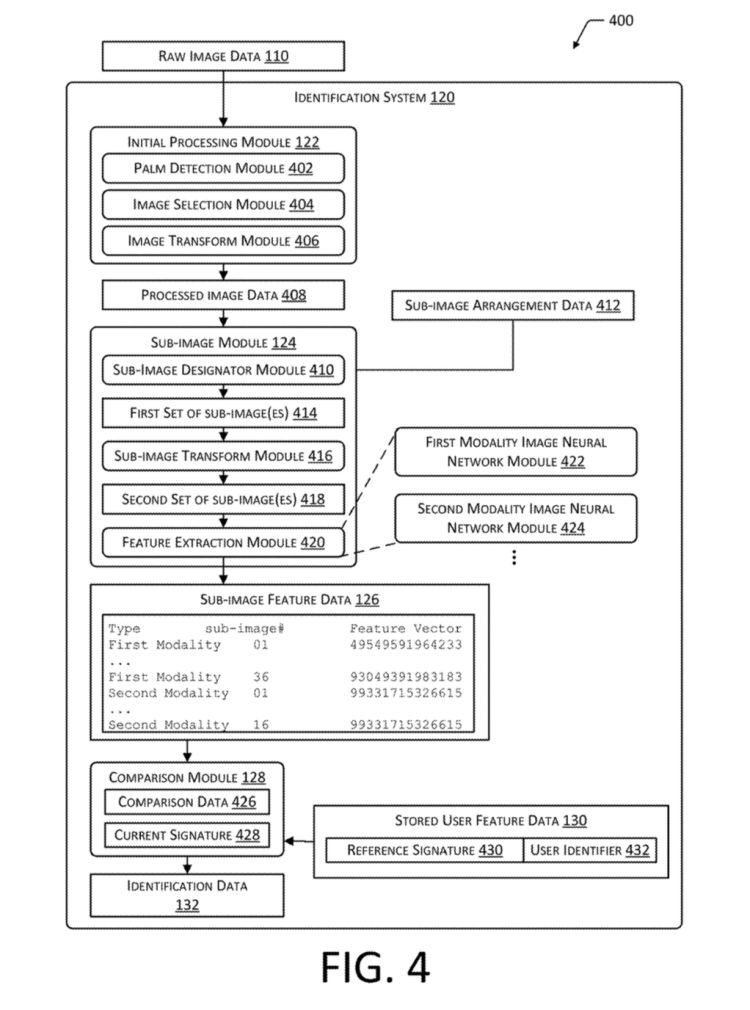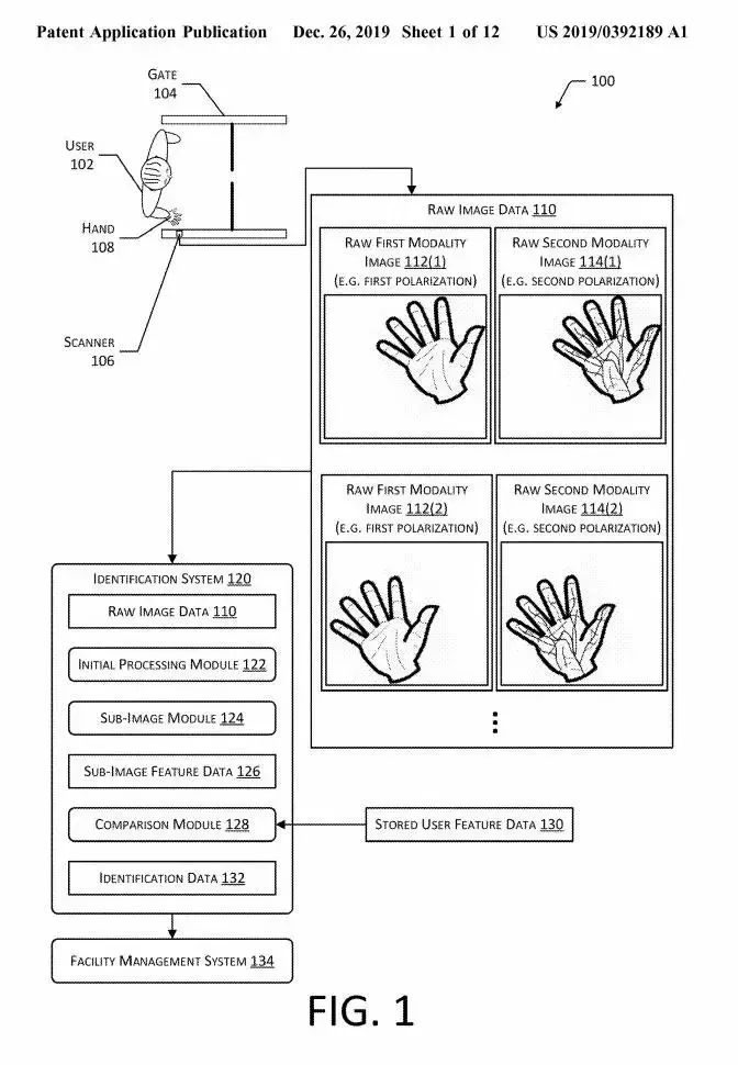 在公开的专利申请中,亚马逊称,人手识别是一种“非接触式的生物识别系统,包括一台能够读取用户手掌信息的扫描仪。”被识别者的手掌信息会被分割为更小的照片,并使用神经网络提取特征向量,和该用户以往的记录进行比对,以验证是本人。在实际应用中,消费者可以将信用卡和手部信息绑定,在结账的时候只需要刷一下手就可以完成付款。