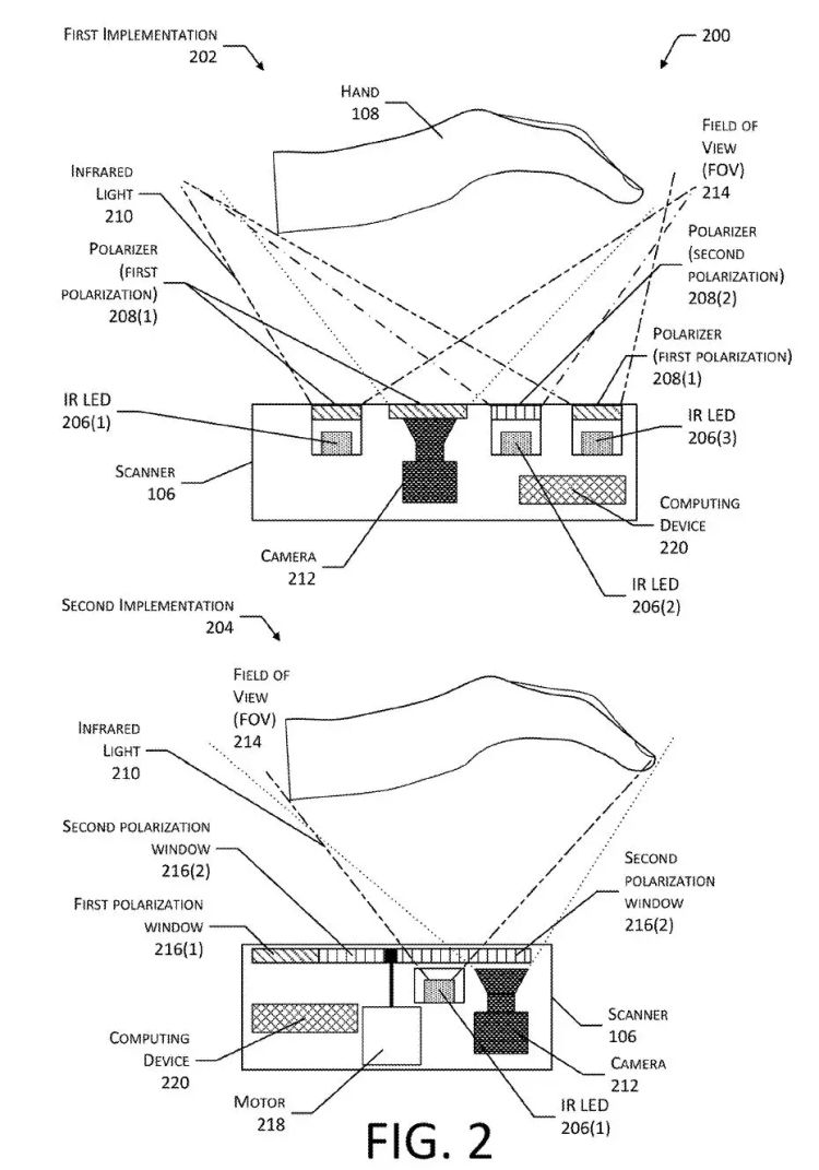 根据亚马逊专利文件中的图示,用户需要把手在一个类似读卡器的摄像头上晃一下(不需要像读指纹一样把手按在屏幕上)。