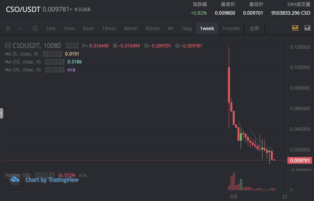 小周心想,此前 IEO 流行”打折上币“,CSO 为博热度如此做倒也情有可原,毕竟市场向下趋势愈发明显。但没想到的是,CSO 开盘即巅峰,此后短时最高价格也仅涨至 0.078 USDT,远不足以回本。