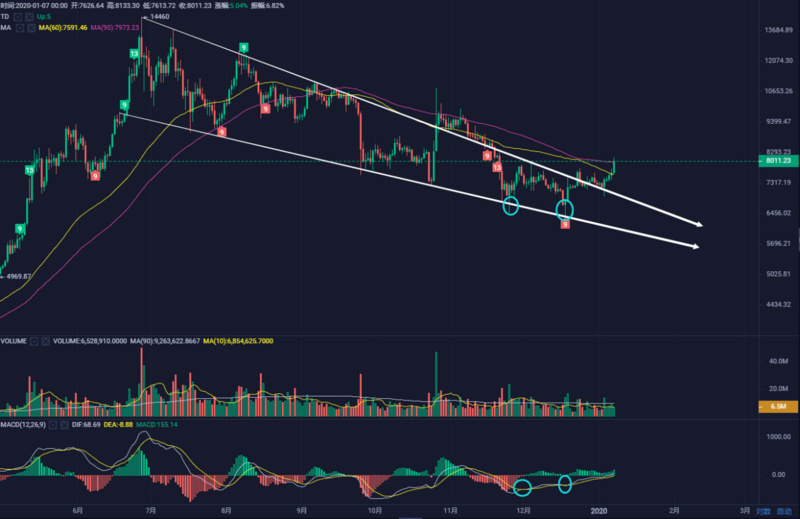 OKEx投资分析总监K爷认为本轮比特币大涨是多方原因导致:“首先是技术面:如下图所示,相信一部分持续关注星球日报的朋友会感到似曾相识,我在19年12月17日的分析分享中呈现过。BTC在12月18日再探6400美金新低后,MACD出现明显底部背离(如图4个蓝圈所示,价格拐点出现新低,指标拐点未出新低,称为底部背离)的中期看涨信号。随着强势反弹出现,12月23日价格突破白色下降通道上边界重要阻力,出现第二个看涨信号,多头主力似乎蓄谋已久。”
