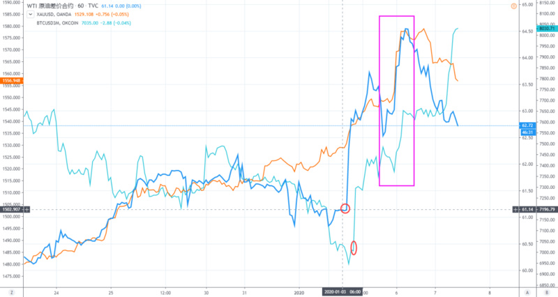 “如上图所示,2020年1月3日6时WTI原油率先拉升(伊朗是中东主要产油国,一旦战争开启,原油供应下降,且需求会增加),12时BTC随后拉升,黄金则表现较为平缓。据媒体报道,空袭事件之后,伊朗当地BTC场外交易价格约10亿伊朗里亚尔,约2.31万美元一枚。随着双方外交言语越发激烈,伊朗民众寓意众筹暗杀川普等事件爆出,资本市场对中东局部战争的危机越发担忧,形成图2紫色框架内BTC、黄金、原油价格的集体拉升。 ”