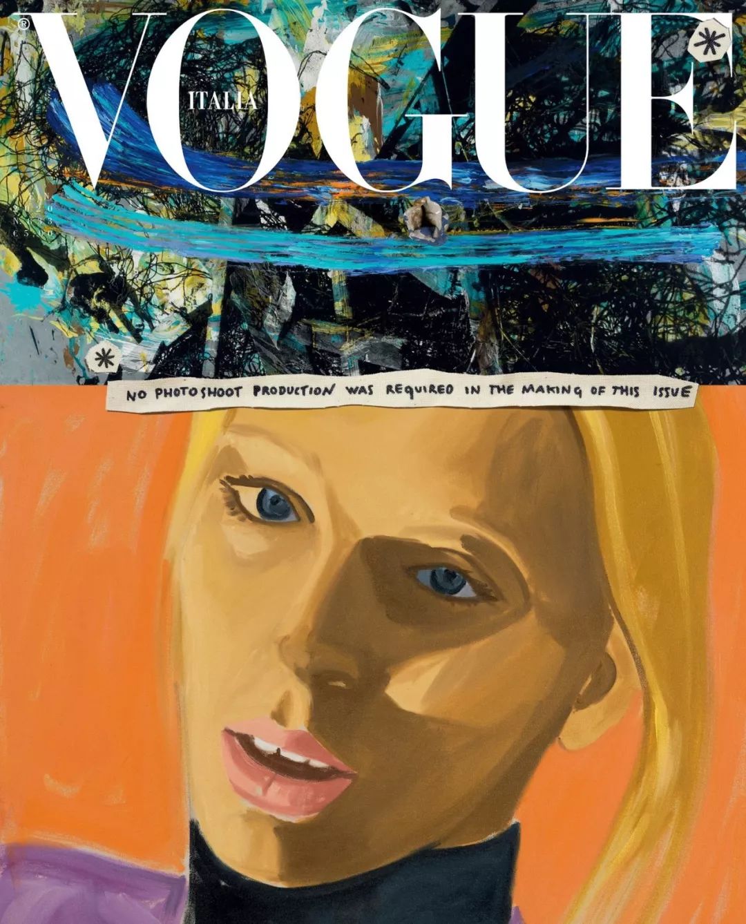 杂志封面上赫然写着“本刊制作过程中不包含任何摄影制作”。莫桑比克美国画家Cassi Namoda则创作了一副模特Ambar Cristal Zarzuela坐在红色椅子上哭泣的画像,模特头附近画着一只滴着鲜血的蚊子,画家称这暗喻全球变暖。