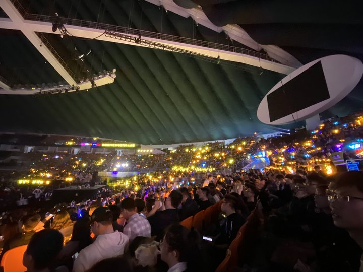 如果你曾对饭圈文化的灯牌 battle 有所耳闻,那你估计能在这里看到更「外放」的粉丝应援之战。灯牌是有的,蓝黄灯光分列场馆两方,但两边粉丝基本没有靠灯牌分胜负的心。