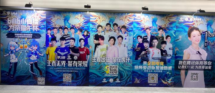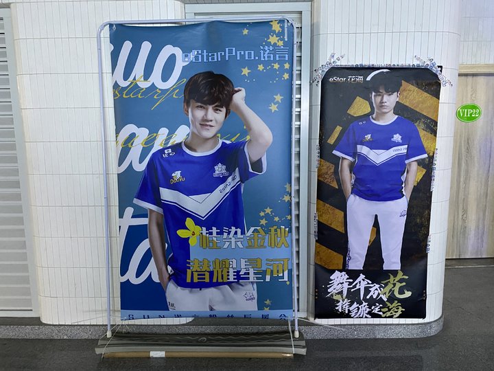 内场有不少狂热的粉丝自动发放灯牌应援,走到座位旁问一声要不要应援,能获得十几个观众的积极响应。场馆前粉丝自动布置的展示牌和海报,显示着这些电竞选手的超高人气。