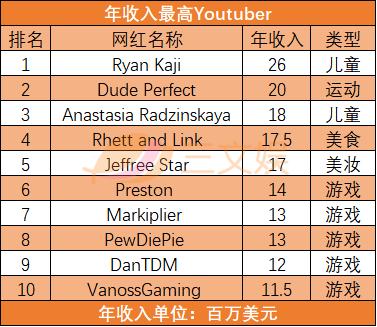 福布斯的计算方式是计算YouTuber们2018年6月1日至2019年6月1日之间,来自贴片广告、品牌赞助、衍生品销售等来源的收入。