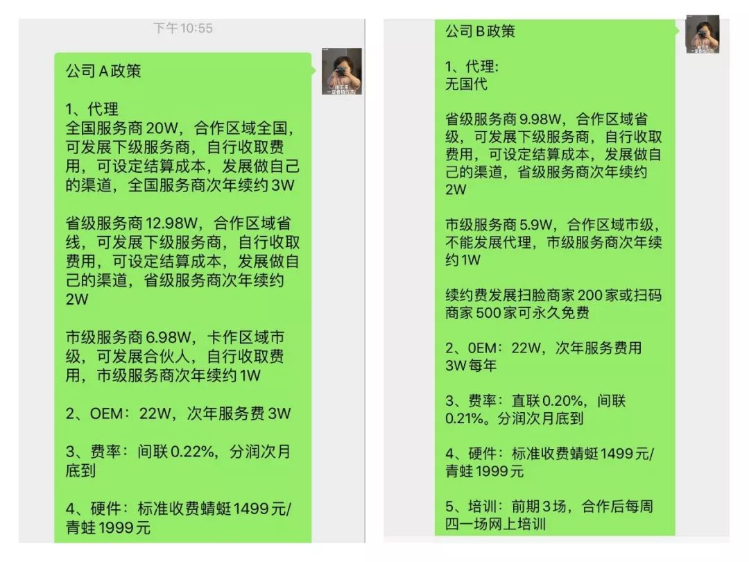 图为网友提供的两张不同支付公司,招募代理的收费政策。