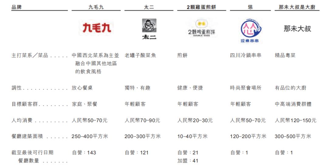 具体来看,“九毛九”主打西北菜系,“太二”专注于酸菜鱼,“2颗鸡蛋煎饼”是一家煎饼店,“怂”的主营业务为冷锅串串,“那未大叔是大厨”则为精品粤菜。