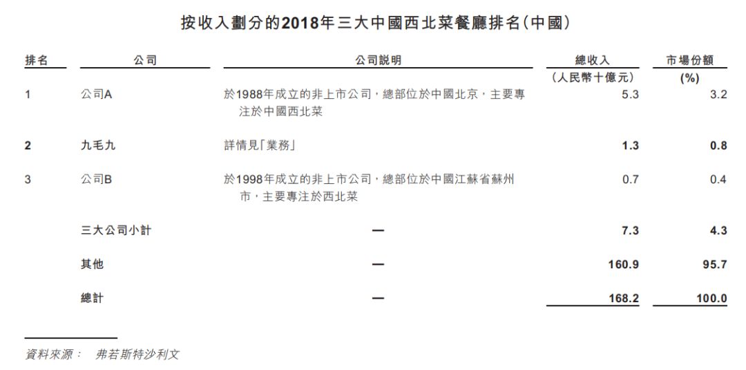 根据研究机构弗诺斯特沙利文的数据,“九毛九”虽为西北菜市场份额第二的品牌,但距第一名西贝莜面村存在明显差距:2018年“九毛九”的市场份额占比不足1%,总营收为13亿元,仅为西贝莜面村营收的约四分之一。