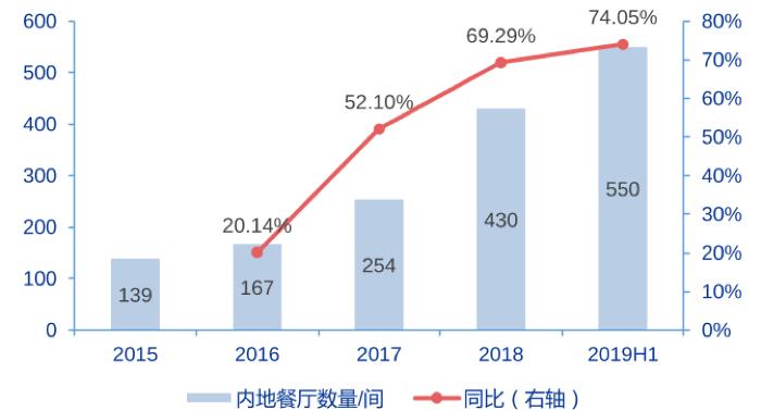 同店数据已经触顶,海底捞只能从门店扩张的道路上取得增长。实际来看,近年来海底捞一直在加速扩张门店,2019H1门店数量更是同比增加74.05%,增速创了新高。