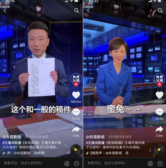 随着这些平台的出现,原先“被动营业”的央视名嘴们也开始画风大变。2019年8月19日,康辉与欧阳夏丹录制了一则揭秘主播稿子的短视频,视频中康辉颇为活泼地一边喊着“噔噔蹬蹬”一边对镜头展示讲稿,欧阳夏丹甚至用一句英文俏皮地附和正在讲解的康辉:“me too(我也是)。”二人的画风与平时直播间里的面貌形成巨大反差,这则短视频在抖音上获得600万点赞、10万评论和2.5万转发。