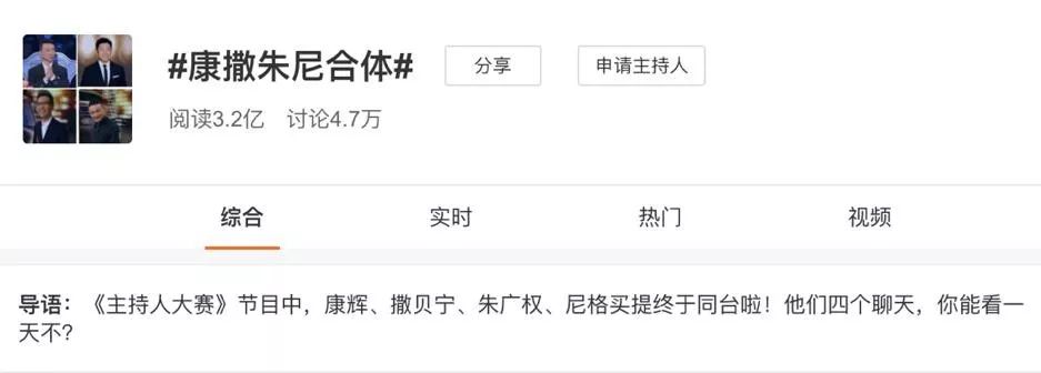 随着《中央广播电视总台2019主持人大赛》的热播,在节目中担任评委的央视名嘴们话题度随之升高,尤其是由康辉、撒贝宁、朱广权、尼格买提四位男主持组成的“康撒朱尼”组合,频繁地出现在文娱新闻和微博热搜上——12月7日,他们在《主持人大赛》中首度合体同框的相关话题在微博获得3.2亿阅读量和4.7万次讨论。