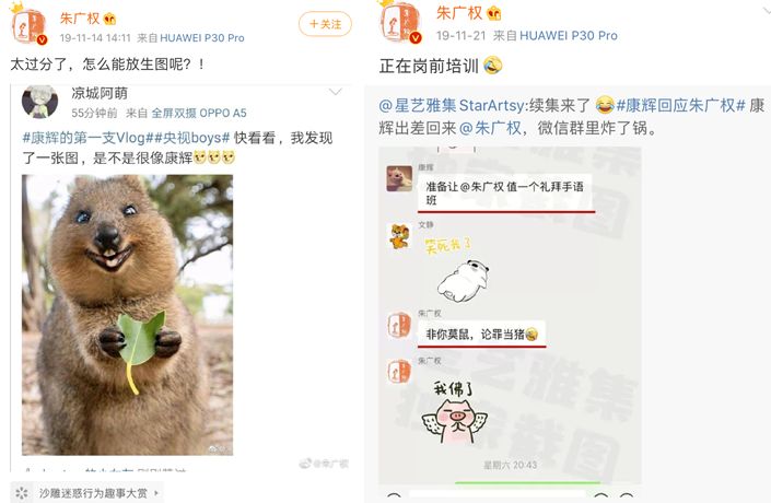 另一个官方营业主场景是微博。朱广权转发了网友发布的“撞脸”康辉的松鼠图片,并配文“太过分了,怎么能放生图呢?! ”,几天之后便有博主晒出央视主播的微信群聊截图,图中康辉艾特朱广权让他“值一个礼拜手语班”,朱广权则回复道“非你莫鼠,论罪当猪”。随后,朱广权转发此博并写道“正在岗前培训”。