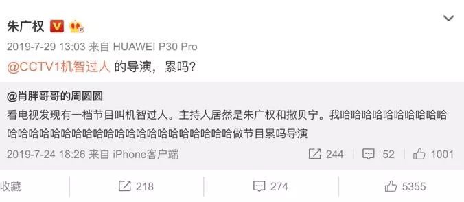 2019年初,朱广权与撒贝宁共同主持综艺《机智过人》,引发了网友的关注,一位微博用户表示:“主持人居然是朱广权和撒贝宁,哈哈哈哈做节目累吗导演?”这条微博被朱广权翻拍,他@ 出节目官博帮网友问道:“《机智过人》的导演,累吗?”