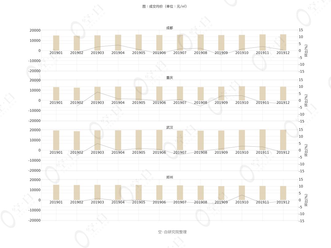 从成交价格来看,武汉上月成交均价达到20164元/平米,环比变化为-1.58%。成都成交均价环比上涨0.55%,涨幅最大。