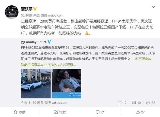 随后,法拉第未来前CEO贾跃亭在微博转发此文称,FF91表现优异,“全球超豪华电动车续航之王“的称号实至名归。他还在微博中提到国产特斯拉已经下线,表示FF还在奋力前行,感恩所有支持者的支持。