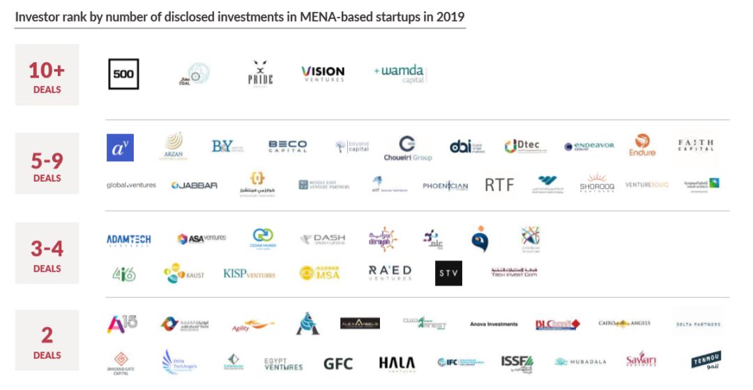 最活跃的投资机构是总部位于美国旧金山的 500 Startups 、阿拉伯天使投资 OQAL 、专注金融科技的埃及风投 Pride Captial 以及阿联酋风投 Wamda Captial ,投资交易次数超10次。