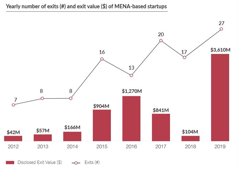2019年,中东北非初创公司退出的数量比以往任何时候都要多,达到27个,退出时的总估值达到36亿美元。该区的电商和运输业都高度分散,投资者和初创企业正在寻求整合。