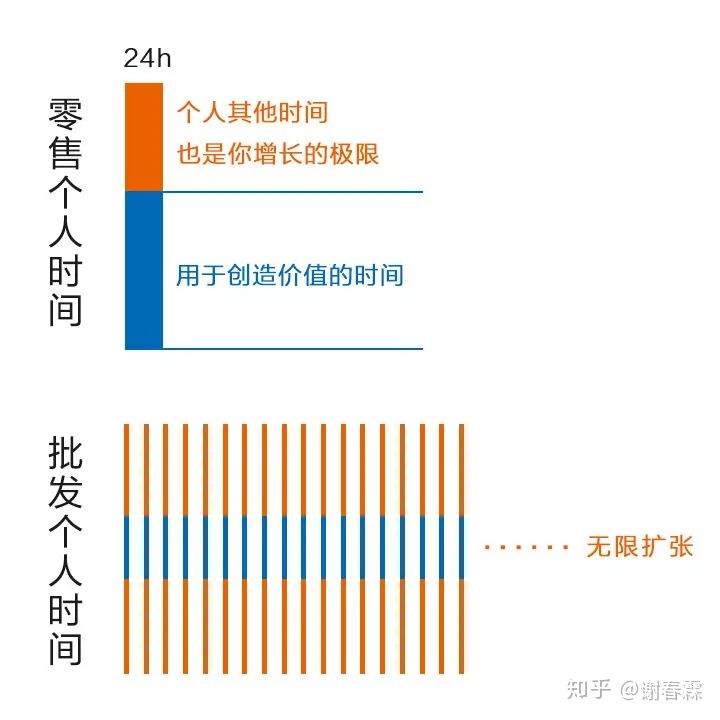 这个就相当于你把自己的时间「批发」出去了!而通过批发的方式来「横向扩展」自己能产生价值的时间是无限的!